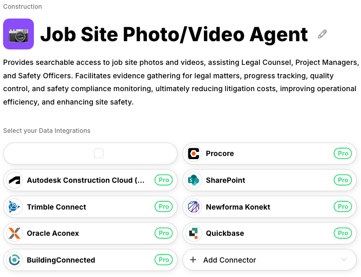 - Automated Evidence Gathering: The Job Site Photo/Video Agent searches and retrieves relevant photos and videos from specific date ranges, while the Data Extraction Agent pulls structured data from incident reports, daily logs, and inspection documents across Procore, Autodesk Construction Cloud, and FieldWire, eliminating the documentation scramble that consumes critical investigation hours.