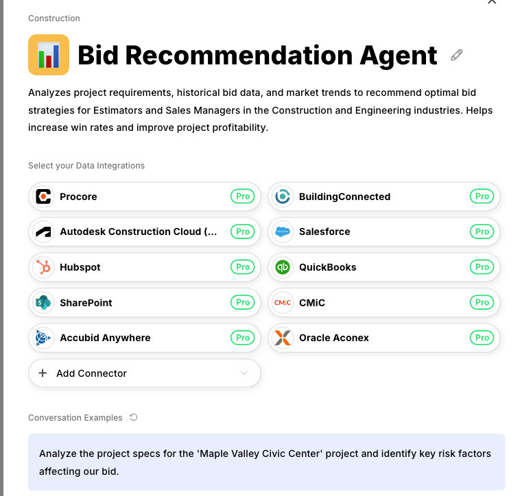 For example, when preparing a school renovation bid, the AI agent can identify that successful past bids for similar educational projects typically included certain contingency levels for hazardous materials removal, allowing you to adjust your approach accordingly.